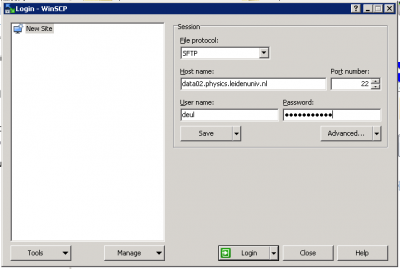 Local machine we can trust, but your personal laptop or your machine at home may be connected from Internet so you need to build a tunnel to see the files on the data storage device. The best program, and most easy way, to do this is calle WinSCP (Windows secure copy). Get your copy at the WinSCP site. Once installed you start the WinSCP program and setup the connection to the data02 server: