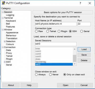 Local machine we can trust, but your personal laptop or your machine at home may be connected from Internet so you need to build a tunnel to see the files on the data storage device. The best program, and most easy way, to do this is calle WinSCP (Windows secure copy). Get your copy at the WinSCP site. Once installed you start the WinSCP program and setup the connection to the data02 server: Type in the FQDN (Full Qualified Domain Name) of the server: ssh3.physics.leidenuniv.nl and use your username and password to authenticate. Click on the Logon button and you will be connected at the top level of the directory tree: